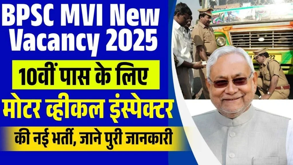 BPSC MVI New Vacancy 2025 : बिहार के उन युवाओं के लिए एक शानदार मौका लेकर आई है जो सरकारी नौकरी की तलाश में हैं। बिहार लोक सेवा आयोग (BPSC) ने मोटर व्हीकल इंस्पेक्टर (मोटरयान निरीक्षक) के 28 रिक्त पदों के लिए भर्ती अधिसूचना जारी की है। यह भर्ती उन उम्मीदवारों के लिए विशेष रूप से फायदेमंद है जिन्होंने 10वीं पास की है और ऑटोमोबाइल या मैकेनिकल इंजीनियरिंग में डिप्लोमा प्राप्त किया है। इस लेख में हम BPSC MVI New Vacancy 2025 से जुड़ी सभी महत्वपूर्ण जानकारी जैसे योग्यता, आवेदन प्रक्रिया, महत्वपूर्ण तारीखें और जरूरी दस्तावेजों के बारे में विस्तार से बताएंगे।